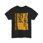 A soft, classic-fit tee that wears like a trusted companion. The front shows a distressed flag motif in warm gold with the vertical word “HIGHLANDERS,” giving the shirt a lived-in, rugged energy. It’s breathable and sturdy — the kind of tee you reach for on road trips, early morning practices, or when you want to rep your team with low-key pride. The crew neckline and tear-away label keep it comfortable all day. Subtle texture in the fabric (natural flecks on some colors) and a carefully printed, slightly weathered design create a handcrafted feel that fits into casual, active, and community-focused wardrobes.